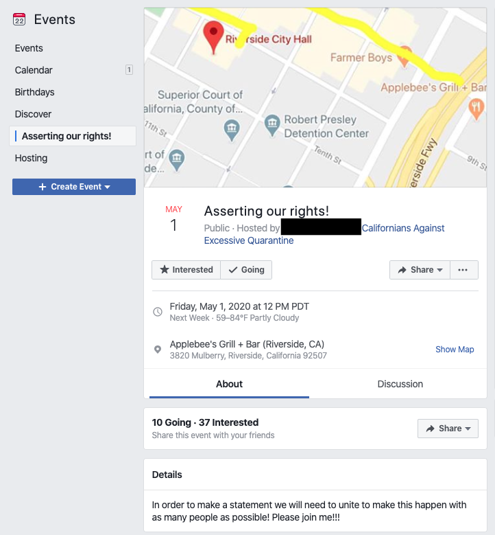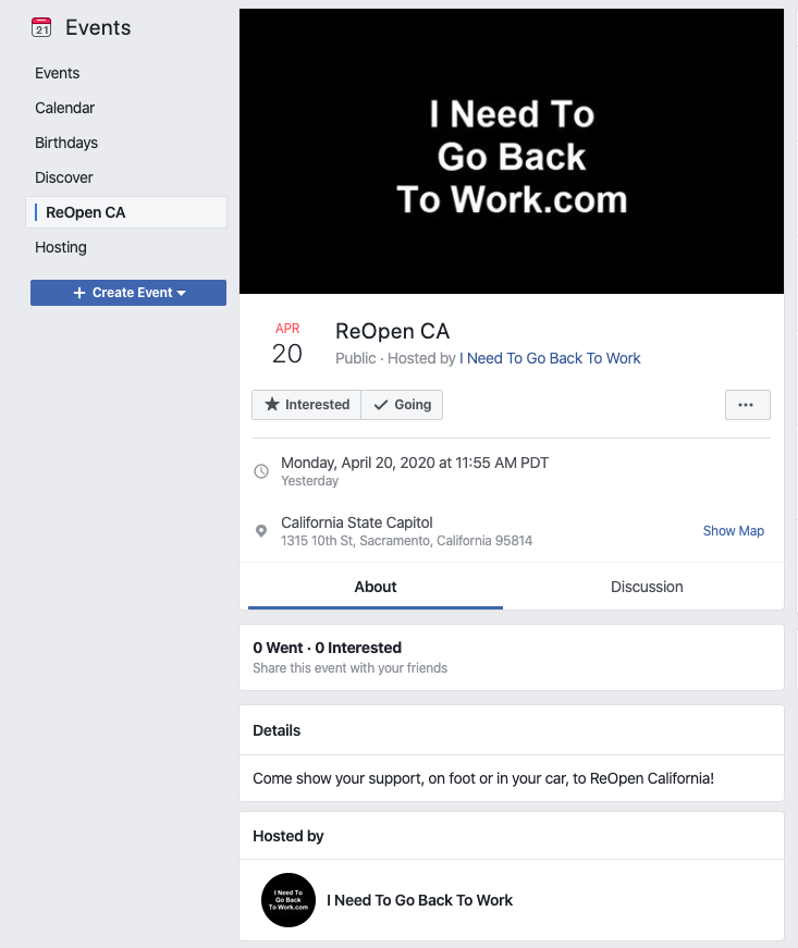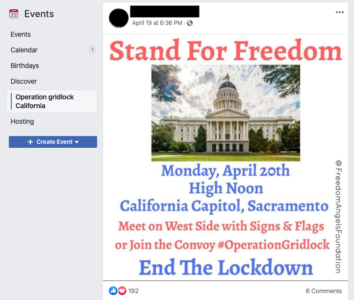 There are at least nine Facebook events for protesting stay-at-home orders in California still live on Facebook, including: