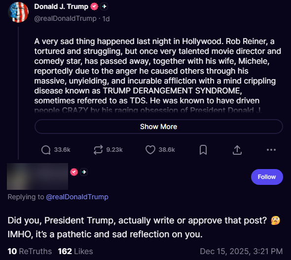 • One Truth Social user wondered whether Trump was the one to “actually write or approve that post,” adding, “it’s a pathetic and sad reflection on you.” [Truth Social, 12/15/25]