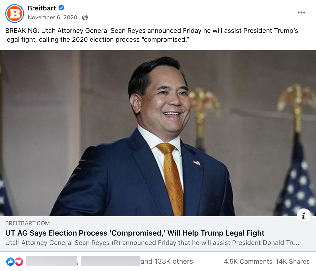 - Breitbart’s post with the most interactions since 2017 is a video from June 21, 2020, that allegedly showed a “black man harassing Trump supporters” and has 30 million views.