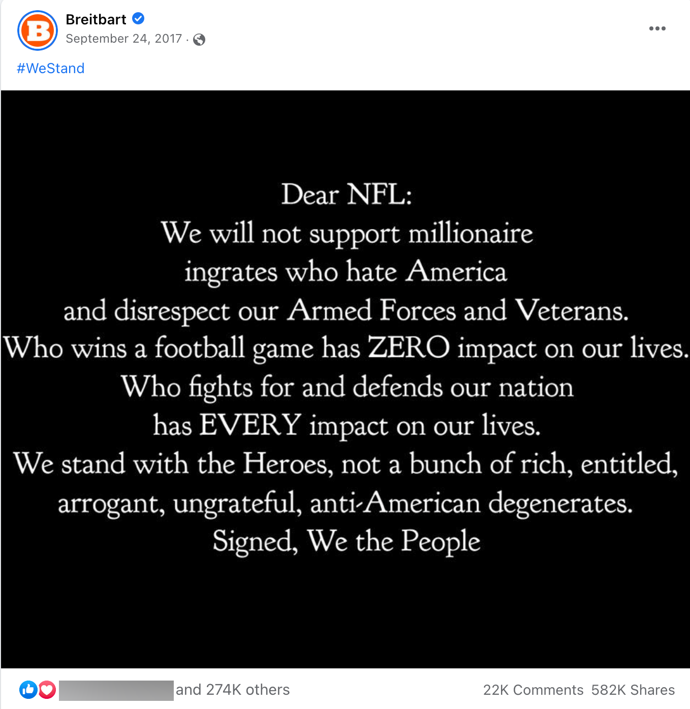 - Six of the top 10 posts from Breitbart that were created between January 1, 2017, and November 30, 2021, contain videos with divisive content related to immigration, guns, nationalism, or race that have earned tens of millions of views.