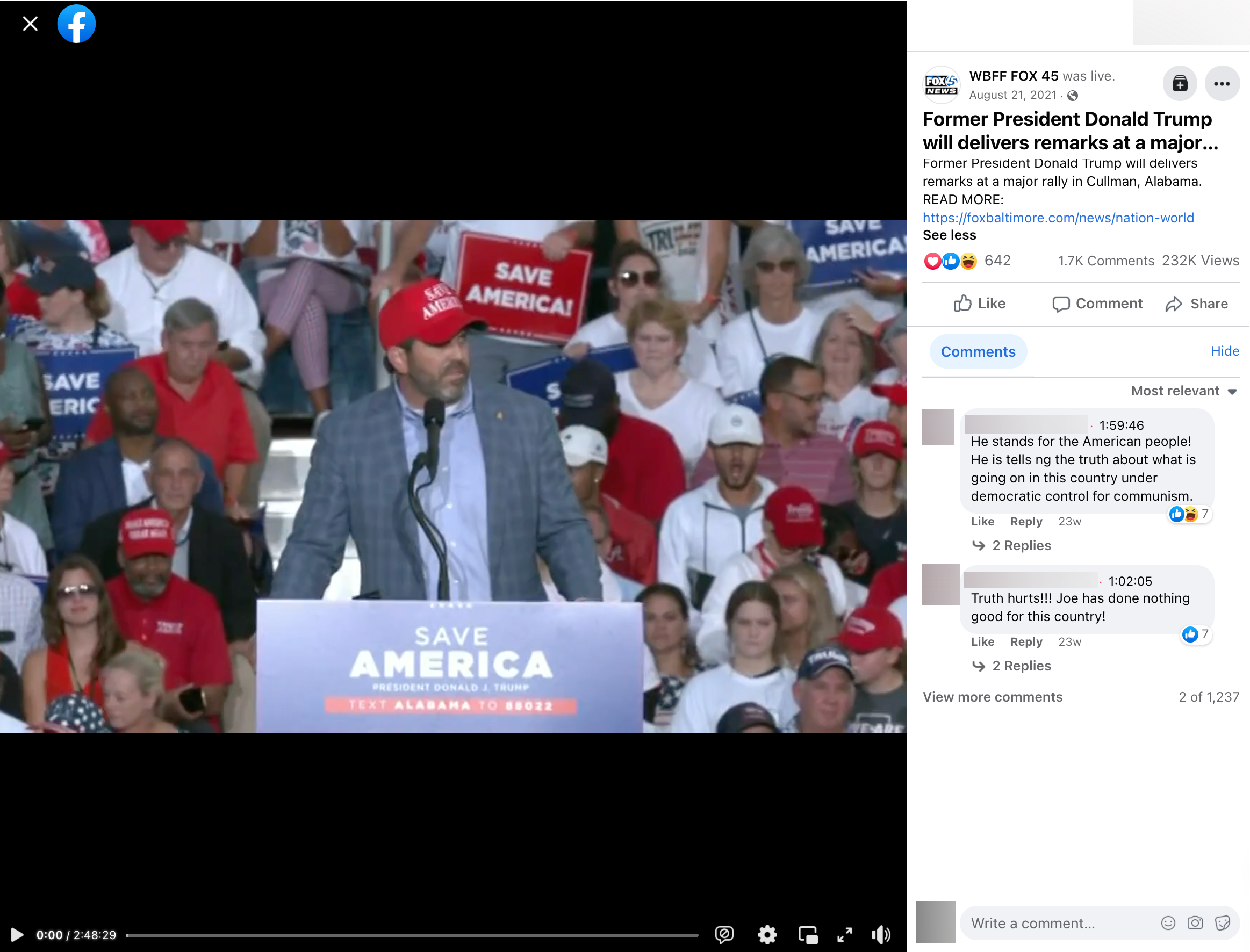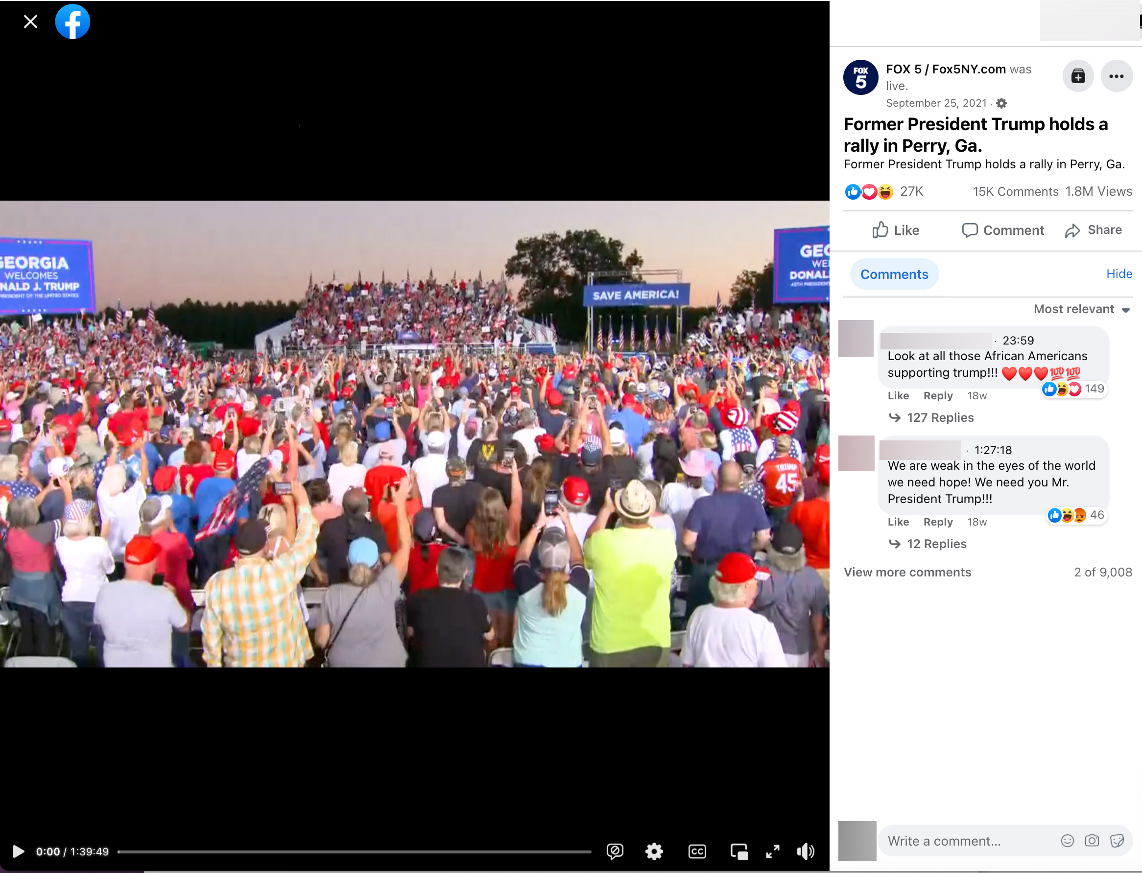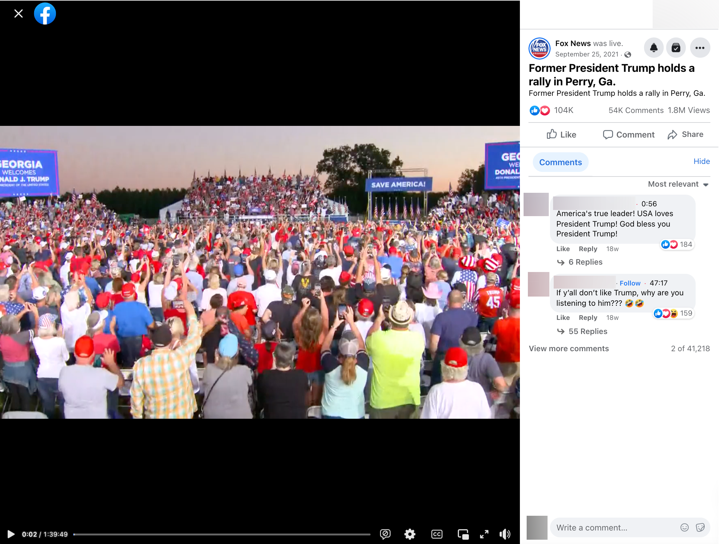 Regardless of this misinformation; Trump’s suspension from the platform for his role in inciting the events of January 6; and Facebook’s alleged bans of posts or ads that are “in his voice,” live videos of the rallies (including of Trump’s speeches, the crowd, and others speaking) earn millions of views.