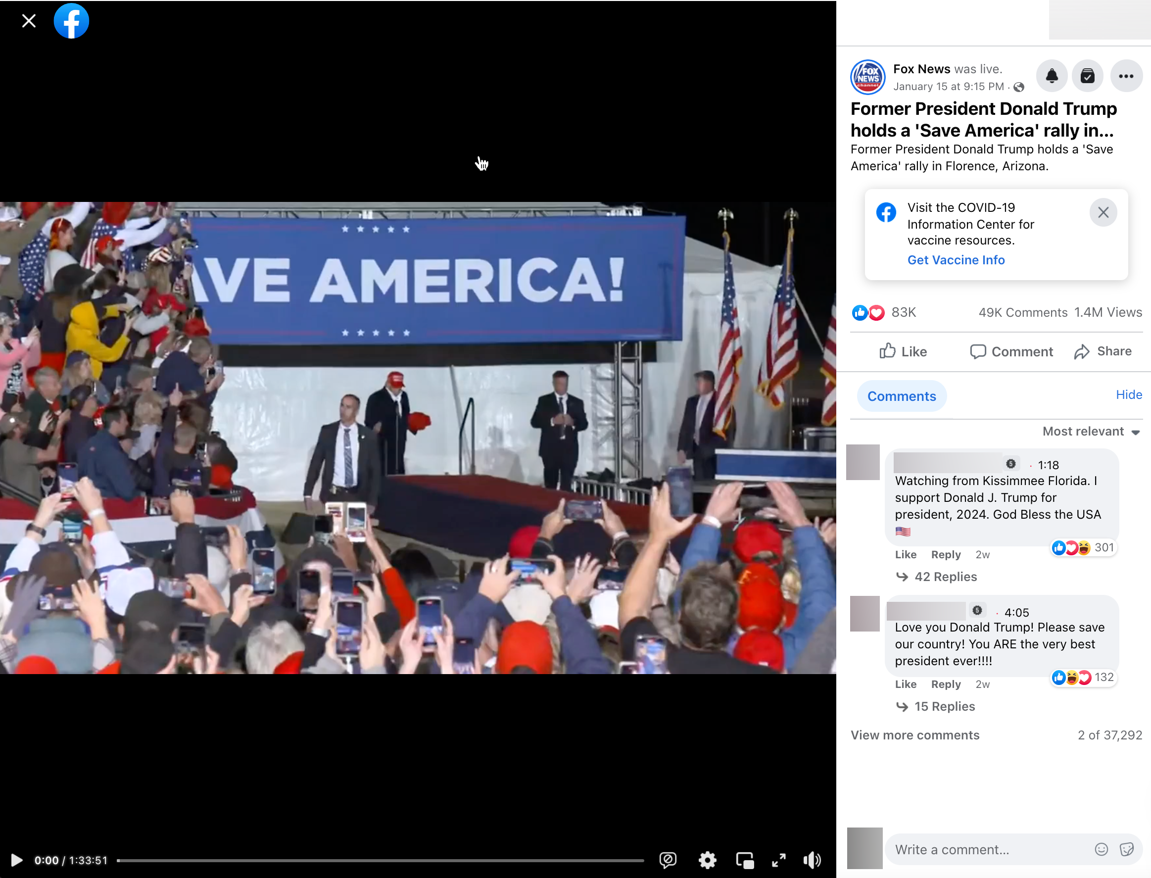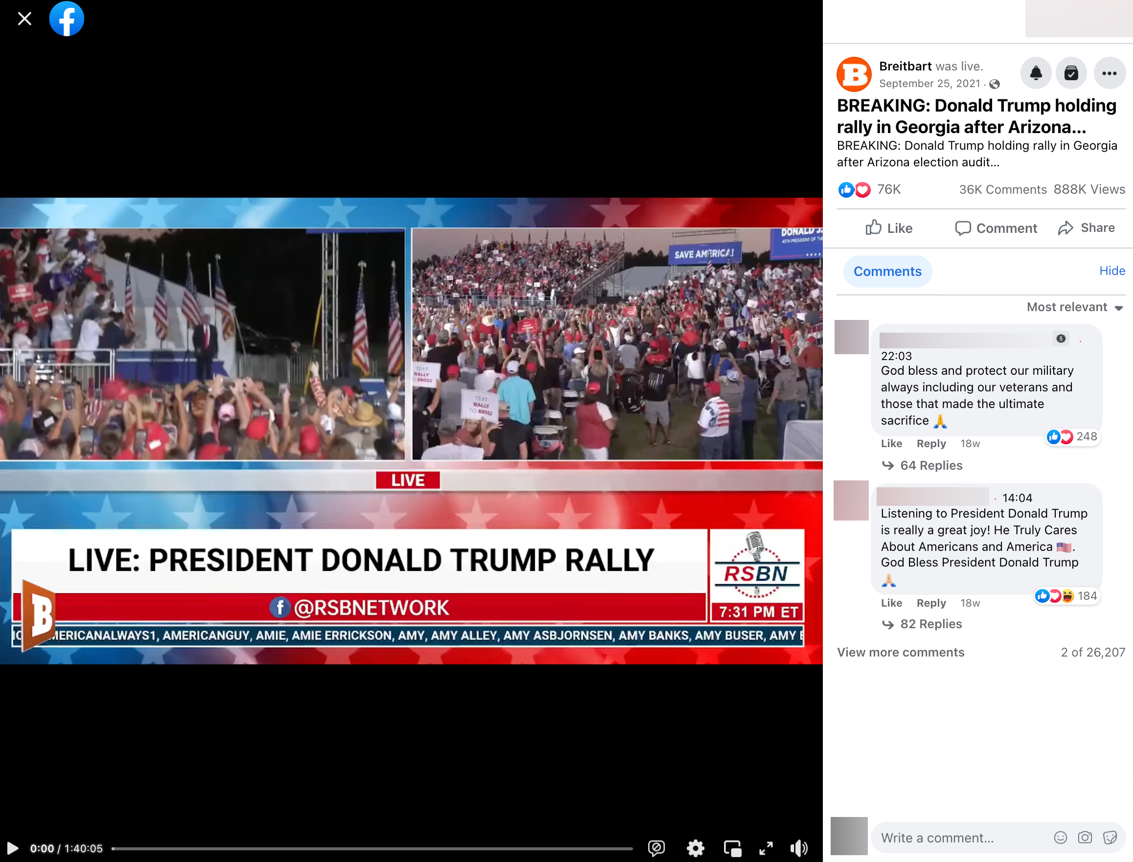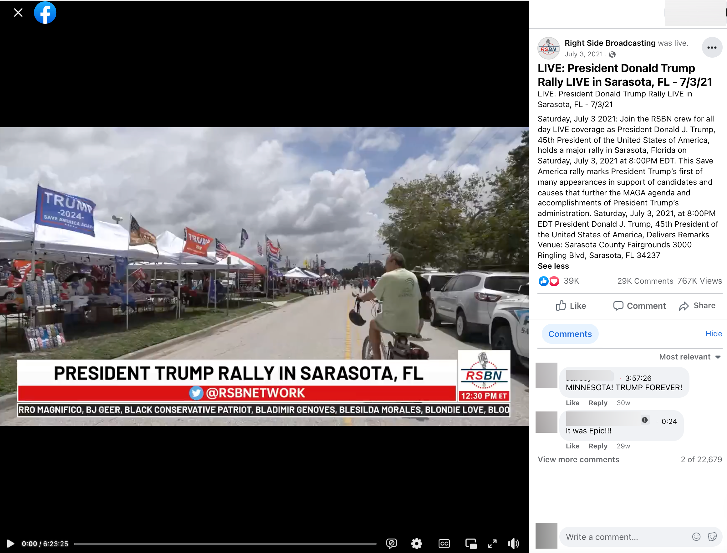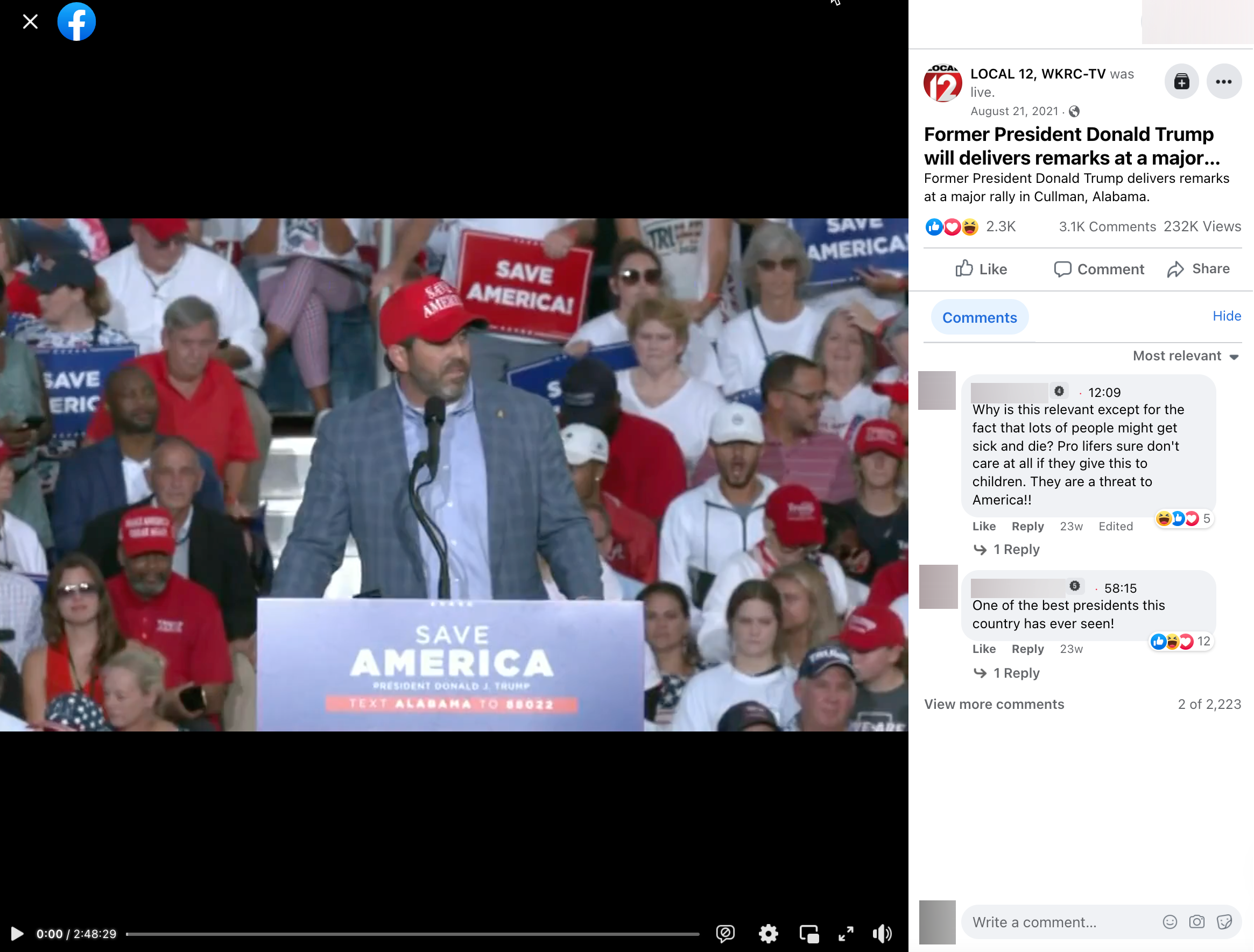 Regardless of this misinformation; Trump’s suspension from the platform for his role in inciting the events of January 6; and Facebook’s alleged bans of posts or ads that are “in his voice,” live videos of the rallies (including of Trump’s speeches, the crowd, and others speaking) earn millions of views.
