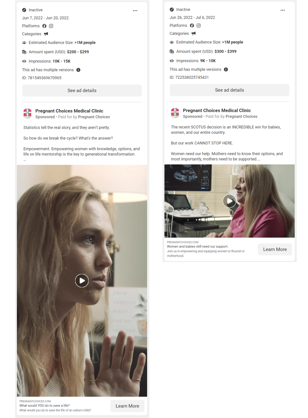 Other anti-abortion organizations have also run ads related to abortion pills since the draft opinion was leaked. One crisis pregnancy center in Georgia has run at least 15 ads with video testimony that mentions abortion pills. The ads cost at least $1,800 and earned at least 63,000 impressions.