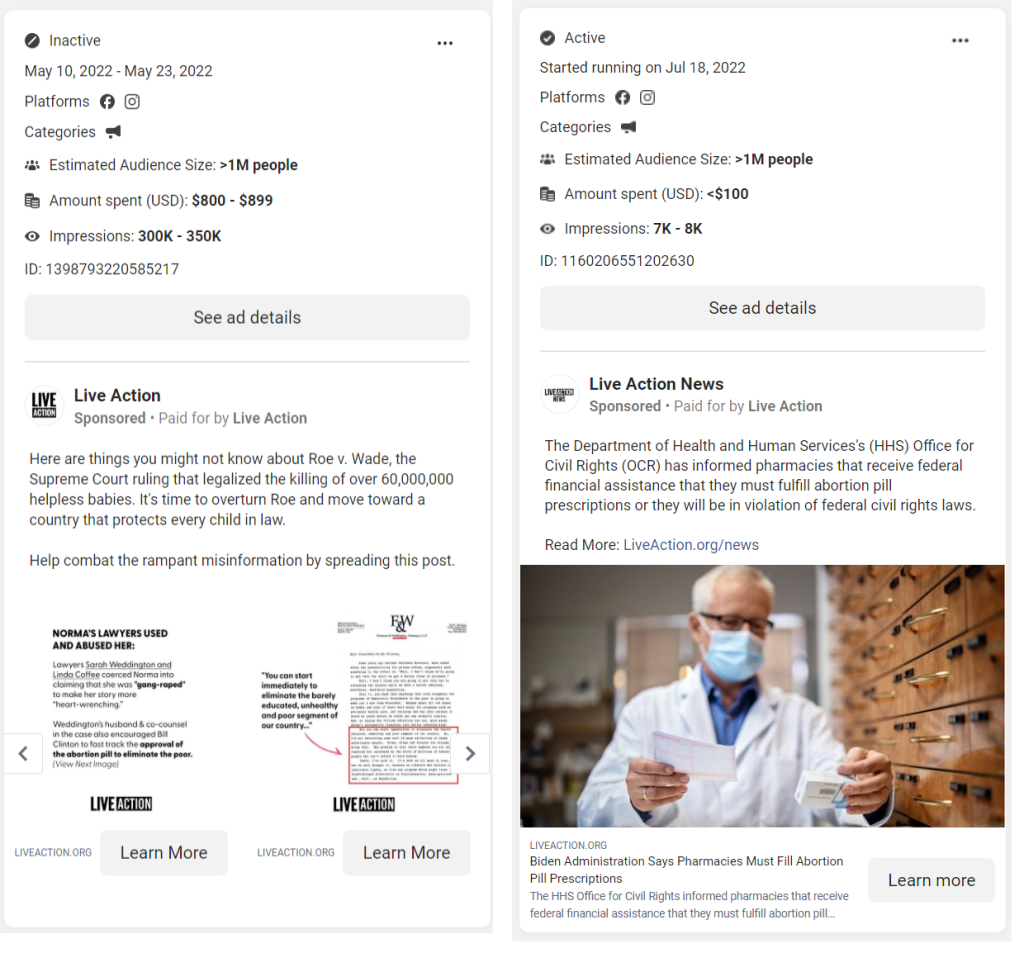 We also found that Live Action has pushed misinformation related to abortion pills since a draft opinion for Dobbs was published by Politico on May 2. In fact, there are at least 9 such ads that were created since then, earning Facebook at least $2,000. The ads were seen over 545,000 times.