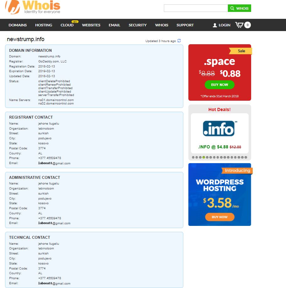 Conservative Today’s page is connected to and has repeatedly posted links (some to fake news) from the website The Breaking, which is registered in Podujevo, Kosovo. Hannityfansofficial’s page has repeatedly posted fake news from the website WebViners, which is also registered in Podujevo, Kosovo. The page has also posted from the website politicreport.info, which is also registered from the town of Podujevo, and fake news from The Breaking. The page of another administrator of the Sean Hannity FANS group, News Donald Trump, is connected to a website with the same name, which is registered in Podujevo. That page has repeatedly posted fake news from the website News Trump, also registered in Podujevo. Additionally, some of the Sean Hannity FANS group moderators and named administrators say on their pages that they live in or are from Podujevo. (One such moderator claims to work for Facebook.) And on the Sean Hannity FANS group page itself, the moderators and administrators have posted multiple fake stories and links to hyperpartisan content from the aforementioned sites or the site News Trumps, which is also registered in Podujevo.