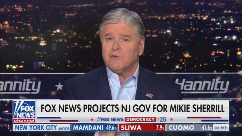 First, New Jersey wasn’t “close in any way” — while the Republican pollsters Hannity hosted over the last month predicted a tight race, Sherrill ended up winning by a dominant 56% to 43% margin. By contrast, outgoing Gov. Philip Murphy beat Ciattarelli by only 51% to 48% in 2021. Indeed, Sherrill’s win was so large that even if all 250,000 people Hannity says left the state had remained, and voted as a block for Ciattarelli, he still would have lost — his deficit is currently more than 416,000 votes.