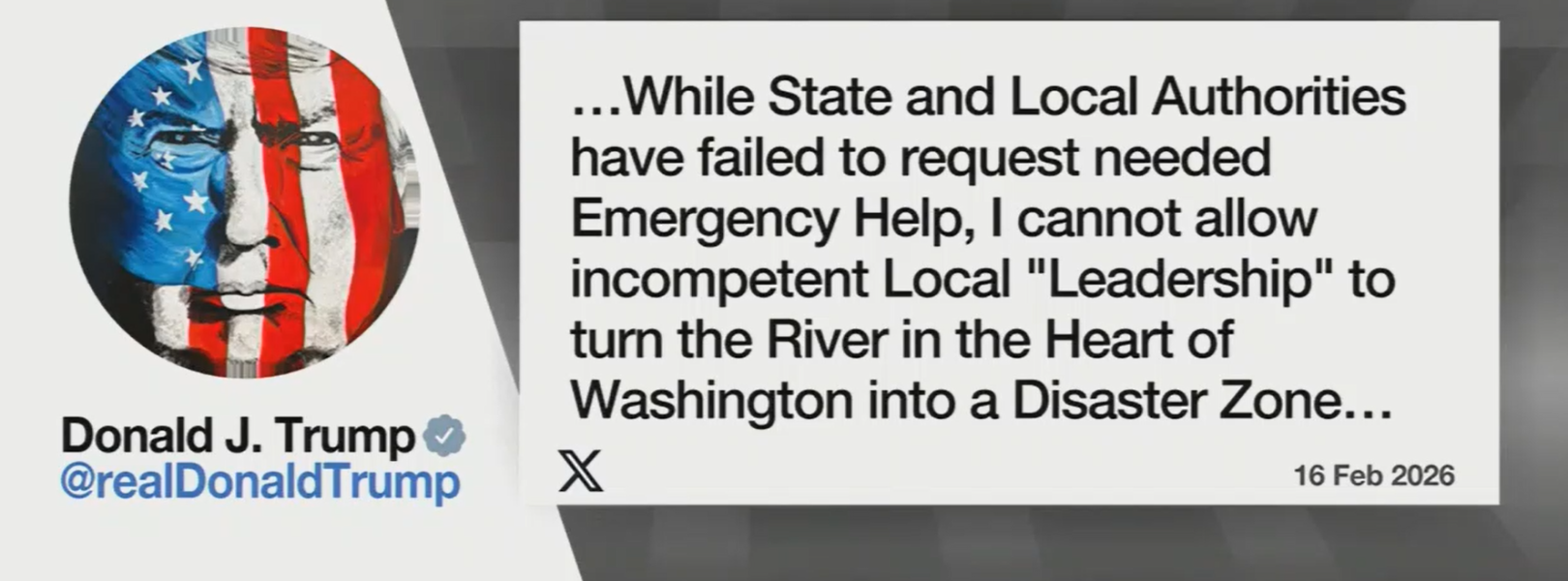 In a February 16 Truth Social post, Trump sparked a blame game over the Potomac River sewage spill, specifically calling out Wes Moore. In a second post on February 17, Trump said that “Maryland, Virginia, and Washington, D.C., who are responsible for the massive sewage spill in the Potomac River, must get to work, IMMEDIATELY. If they can’t do the job, they have to call me and ask, politely, to get it fixed.”