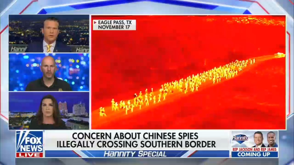 - On the February 10 edition of Hannity, guest host Pete Hegseth fearmongered that there has been “a reported 800% jump in the number of Chinese nationals crossing illegally” in recent months, while the show’s chyron raised “concern about Chinese spies.” Fox News contributor Sara Carter and National Border Patrol Council President Brandon Judd both raised alarm over the migrants, with Carter warning of “asymmetrical warfare” and Judd claiming, “China is involved with every single one of the cartels, and that is a very, very scary issue for the United States.”