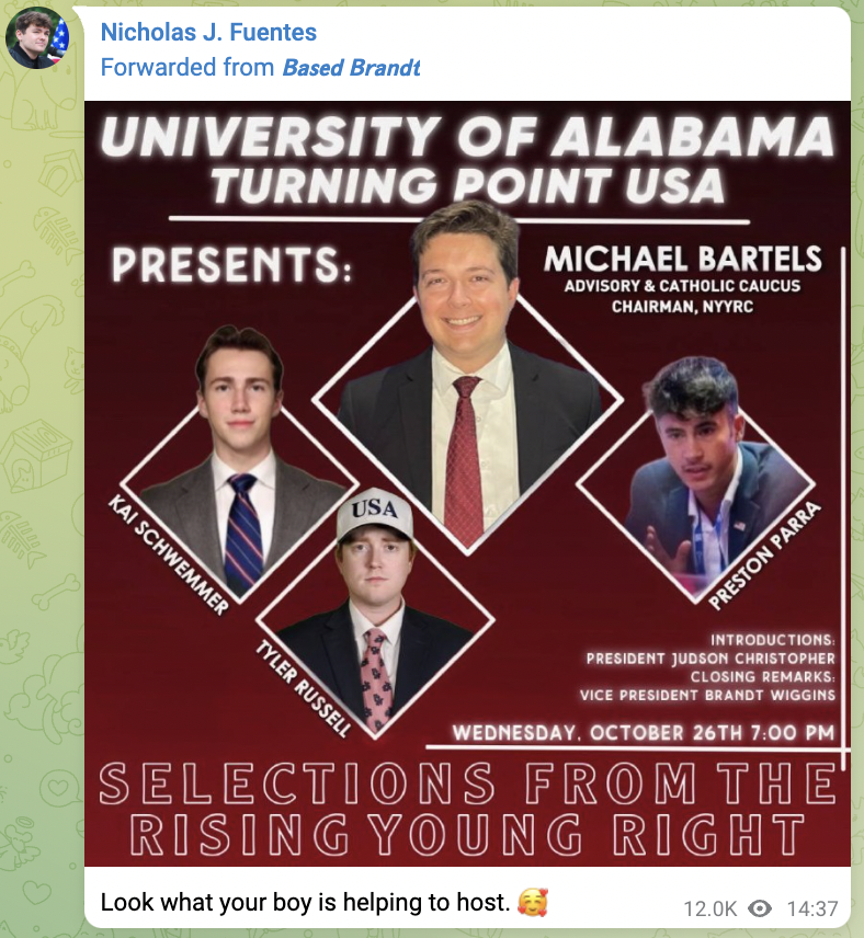 Turning Point USA is a right-wing student organization that was co-founded by far-right pundit Charlie Kirk. The group’s upcoming event at the University of Alabama, which is scheduled for October 26 and billed as a discussion with “selections from the rising young right,” will feature Kai Schwemmer, Tyler Russell, and Brandt Wiggins, all of whom are tied to Fuentes’ “groyper” movement of young white extremists.